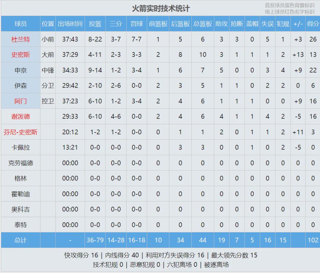 此役過后,火箭升至西部第三,落后第二的馬刺3個勝場。最后看看數據: