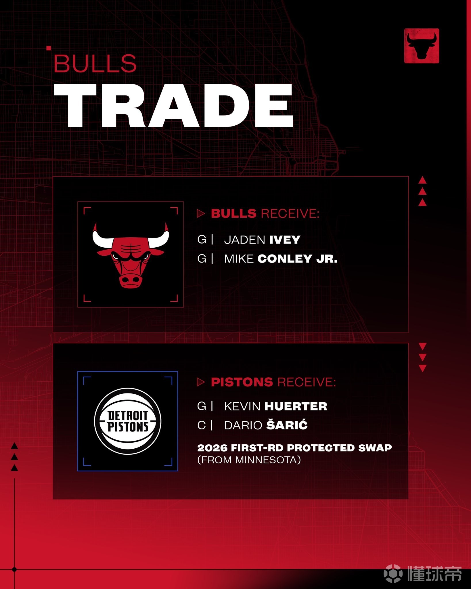官方:公牛通過與活塞和森林狼的三方交易,得到艾維和康利