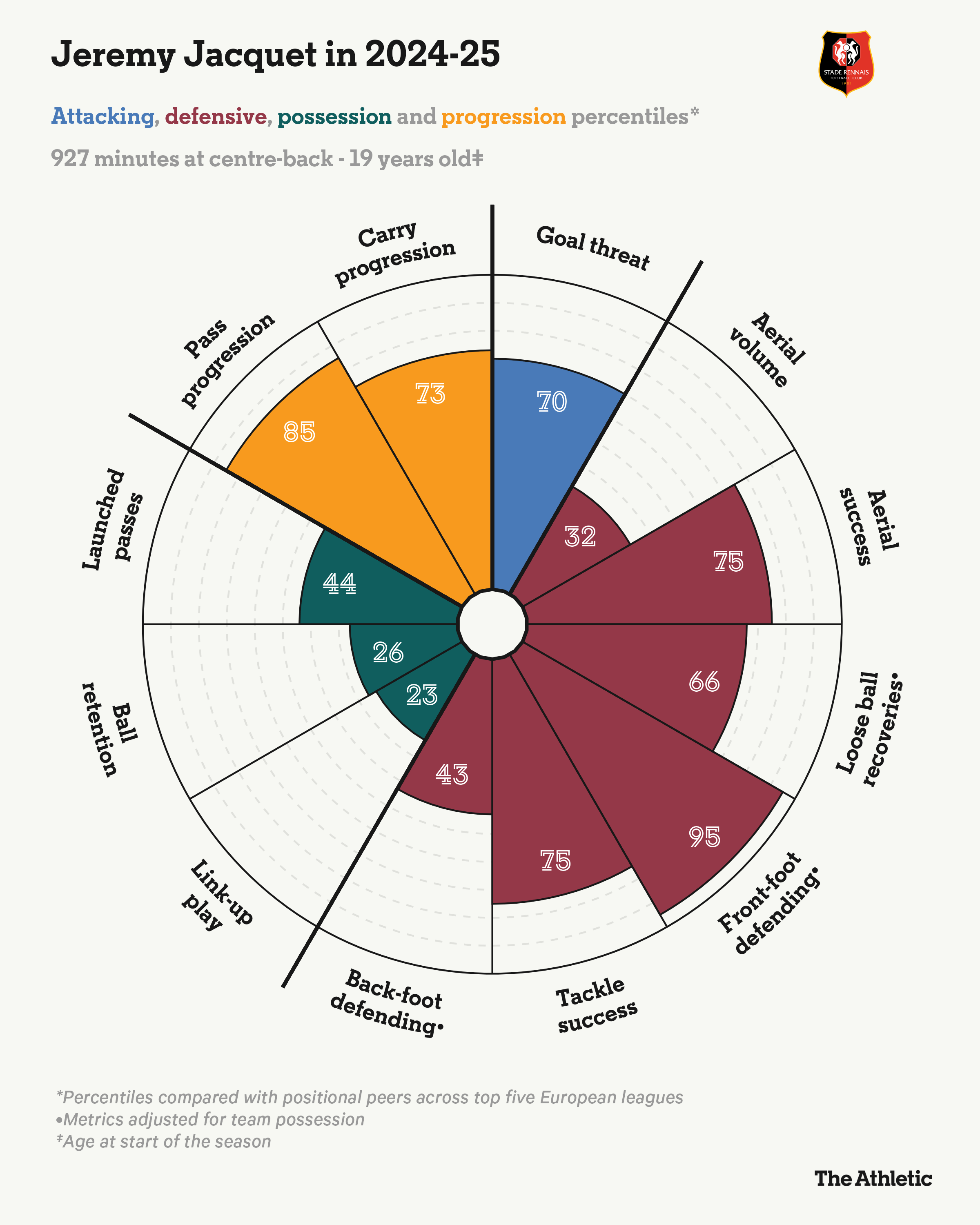 評估中后衛(wèi)有其挑戰(zhàn)性,因?yàn)榉朗財(cái)?shù)據(jù)難以量化,這是由于影響因素眾多。對于雅凱來說,可供參考的樣本量也有限,他曾代表雷恩一線隊(duì)出場31次,并代表法乙球隊(duì)克萊蒙出場24次,他在2024-25賽季開始時(shí)被租借到克萊蒙,之后被召回。不過,在歐洲五大聯(lián)賽中,只有三名U21球員在中后衛(wèi)位置上的出場時(shí)間比雅凱更多。