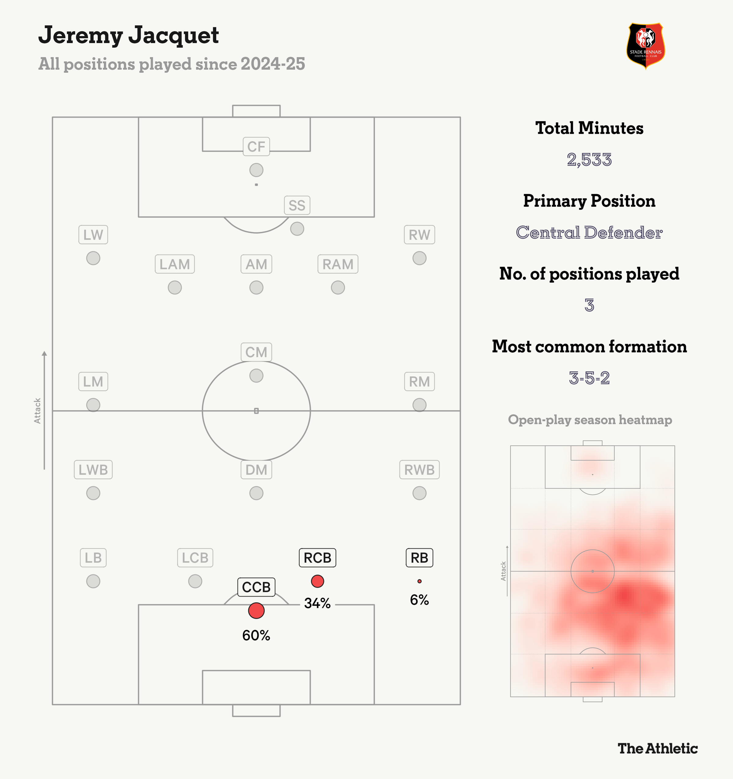 這名后衛(wèi)的身材與今夏加盟的喬瓦尼-萊奧尼相似,實(shí)際上已經(jīng)有著191cm的海拔,因此很難被忽視。雷恩在主教練哈比卜-貝耶的帶領(lǐng)下主要采用3-5-2陣型。雅凱最初擔(dān)任右中衛(wèi),但現(xiàn)在已經(jīng)轉(zhuǎn)型為三后衛(wèi)體系中的居中后衛(wèi)。