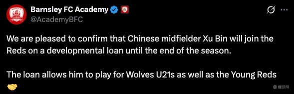巴恩斯利青訓(xùn)學(xué)院的官方公告是:“我們很高興地確認(rèn),中國(guó)中場(chǎng)球員徐彬?qū)⒆鳛榘l(fā)展性租借球員加盟巴恩斯利,租借期將持續(xù)至本賽季結(jié)束。這筆租借將允許他同時(shí)代表狼隊(duì)U21及巴恩斯利青年隊(duì)出戰(zhàn)。”