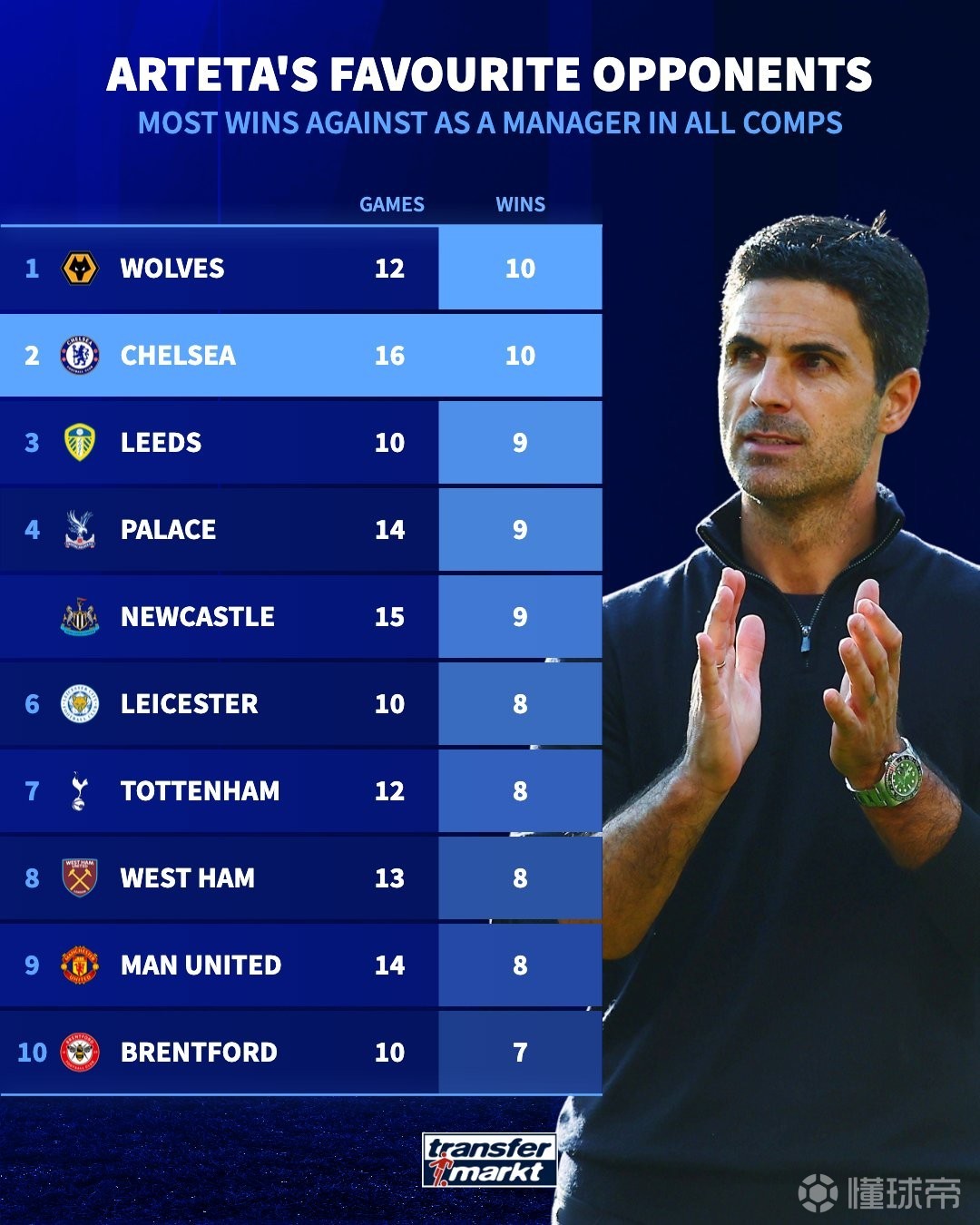 喜歡的對手,切爾西是阿爾特塔贏球最多的球隊,16場取得10勝